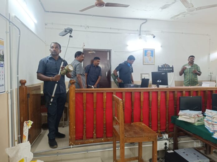 స్పాట్ వాయిస్, క్రైమ్ : వరంగల్ జిల్లా కోర్టుకు బాంబు బెదిరింపు రావడంతో పోలీసులు అప్రమత్త మయ్యారు. బాంబ్ స్క్వాడ్ సిబ్బంది కోర్టు ప్రాంగణంలో వెంటనే తనిఖీలు ప్రారంభించారు. భద్రత చర్యలు కట్టుదిట్టం చేసి కోర్టు పరిసరాల్లో అదనపు బలగాలను మోహరించారు. పోలీస్ బలగాలను చూసిన లాయర్లు కోర్టుకు వచ్చేవారు కొంత భయాందోళనకు గురయ్యారు. ఫోన్ కాల్ ఎక్కడి నుంచి వచ్చింది అనే దానిపైన పోలీసులు ఆరా తీస్తున్నారు.